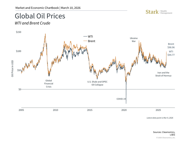 Headlines are reporting the ongoing conflict in the Middle East and the sharp rise in oil prices. Both Brent and WTI prices have jumped above $100, a level often thought to create economic concern. In times like these, it's important to step back and maintain a longer-term perspective, since headlines mentioning "stagflation" and "global economic downturn" can lead investors down the wrong path.